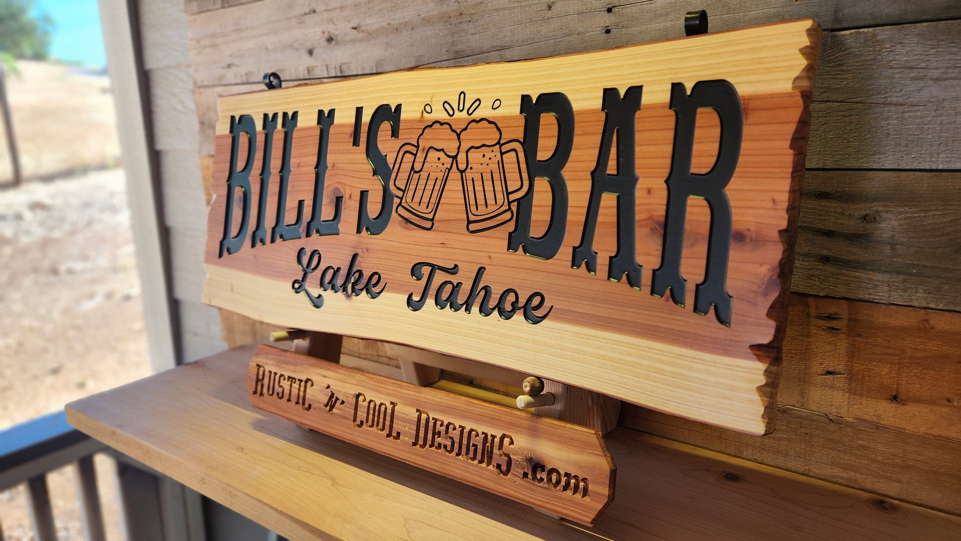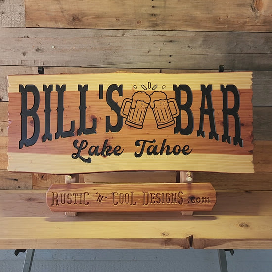 Personalizable bar signs that are made to order. You provide the text you would like carved into the display space. Provide the text within you cart during check out. Whether it's displaying a family name or a special location, this sign is designed to make an impression. Your personalized wording will be carved into a 32” x 12” live edge redwood slab, sure to give you the readability from a distance that you are looking for. The live edge design truly brings out the rustic vibe we at Rustic n' Cool Designs look for. The durable UV and water-resistant finish will provide maximum protection to the elements. Mounting options and hardware are available including the included Seamless Keyhole Flush-fit Mount for wall mounting, or upgrade to the free hanging system. The placement options are endless.